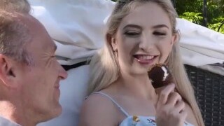 Blonde stepsister takes fat man meat and gets a mouthful of cum