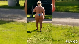 She is mowing in a thong.