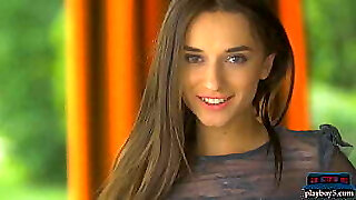 Magnificent and busty super hot brunette babe with a jacket and nothing underneat no bra no panties shows her pussy and naked ass