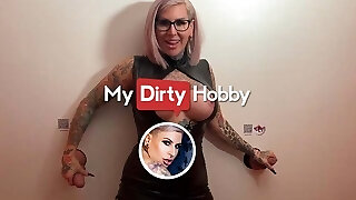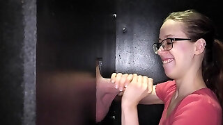 Curvy blonde babe in stockings gets put in a gloryhole room, where she sates cocks with insane skill