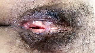 Unload a hairy pussy in the missionary position. Nice view of the big ass! Cum from the hot chubby teen with hairy body!