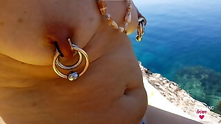 nippleringlover insane milf extreme pierced nipples and pussy nude outdoors on the beach part one