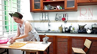Ravioli Time! Nude Cooking. Regina Noir, a nudist cook at nudist hotel resort. Bare maid. Nude housewife. Camera 1